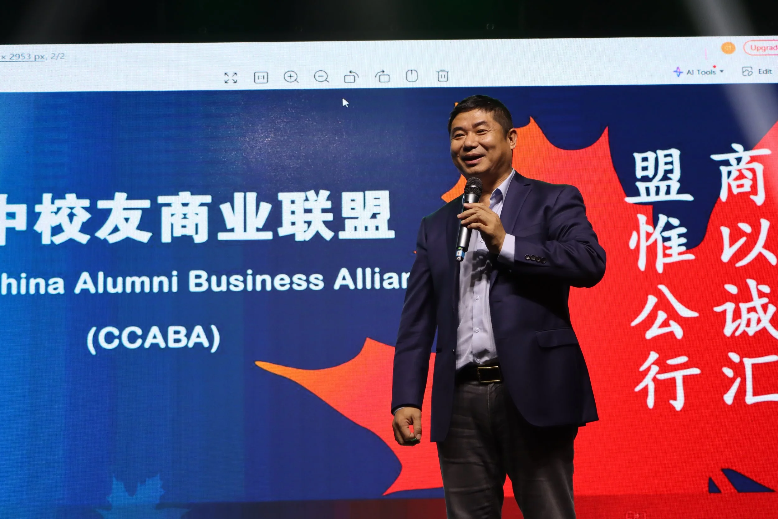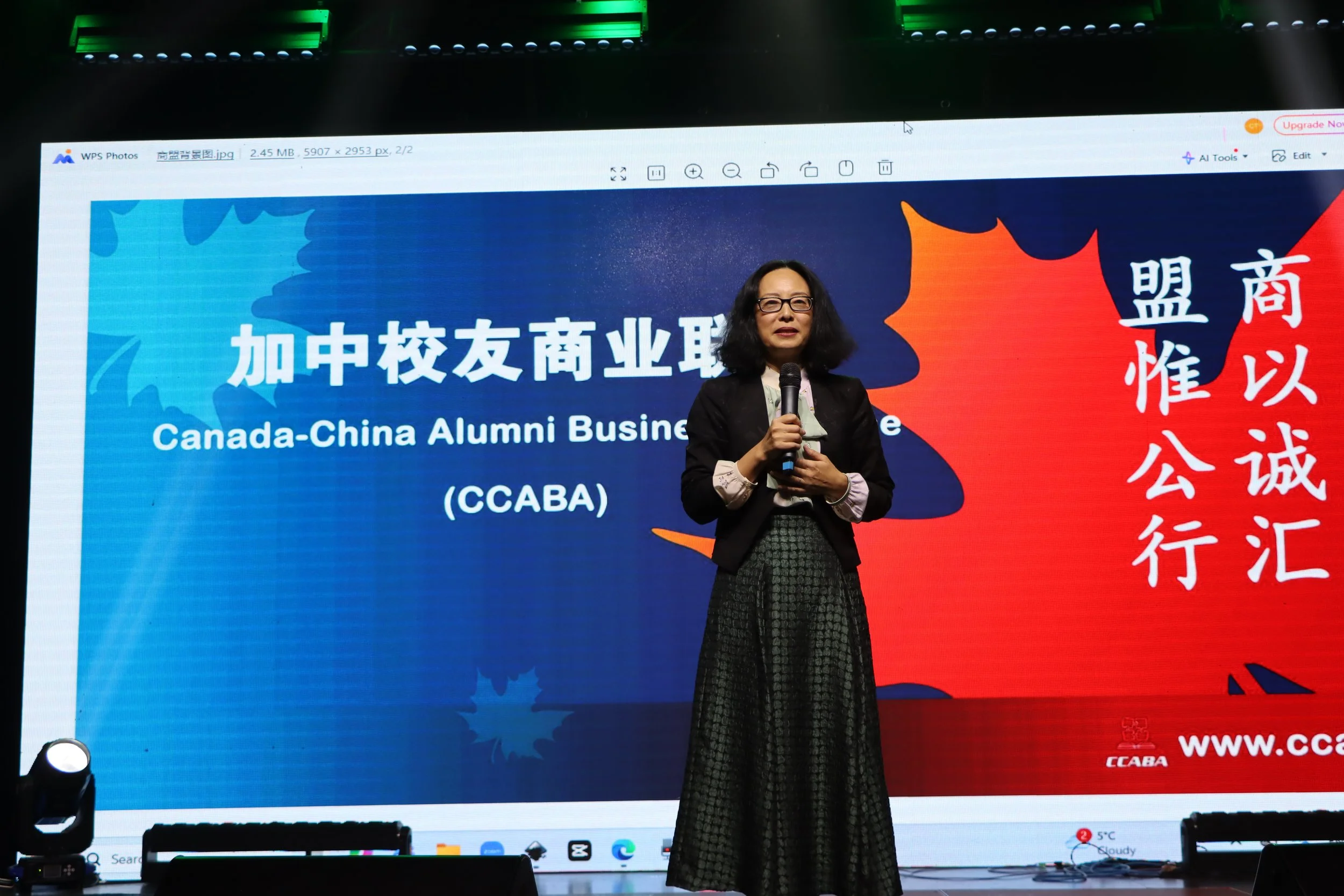 加中校友商盟主席赵东山,新动力总裁王志军,房东网总裁王红伟,黄金赞助商,爱宝保险总裁Linda Gen上台讲话。