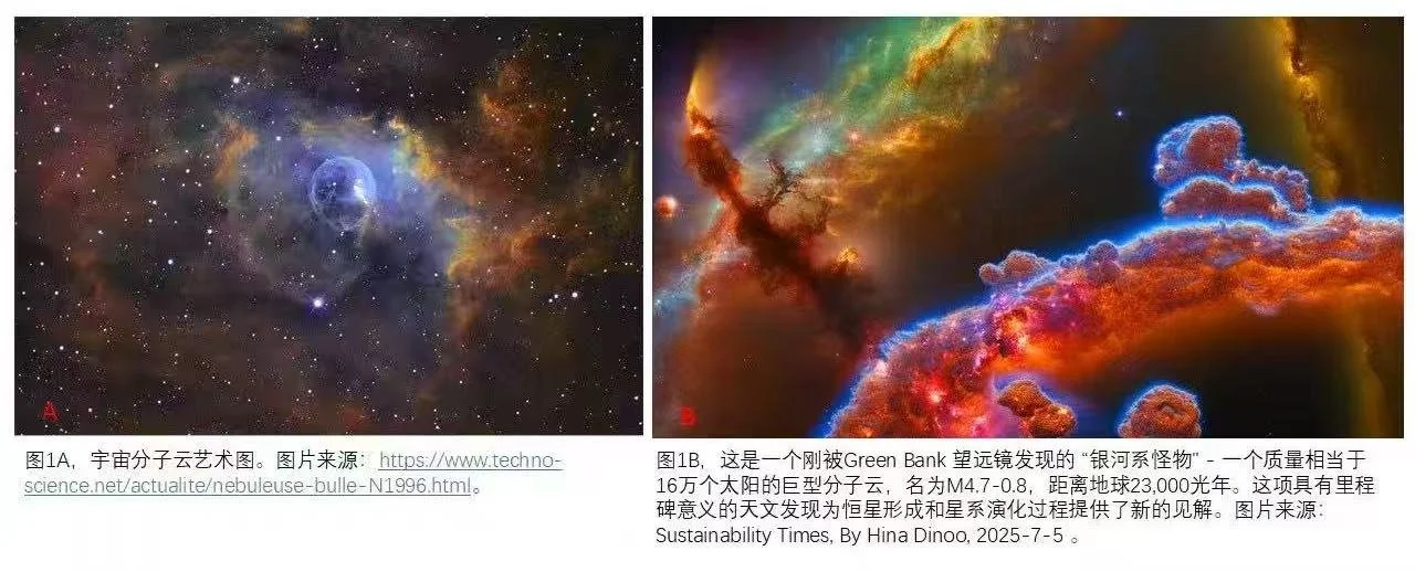 我们的故事要从一片巨大的分子云(Molecular Cloud,或称星际分子云(Interstellar Molecular Cloud)说起。分子云是太阳系的摇篮,是星际空间中由气体(主要是氢气-H₂和氦气-He)和尘埃(硅酸盐、碳质颗粒、冰等)组成的低温高密度区域(图1)。其温度一般为10-50 K(即卡尔文度,相当于摄氏-263°C ~ -223°C),接近于绝对零度(0 K = -273.15°C)。这些云的典型尺度可达数十光年,质量相当于数千到数百万个太阳。分子云内部存在湍流和磁场,使其在引力和外部扰动影响下可能发生坍缩。有趣的是,这些重元素都来自更早世代的恒星,这意味着构成我们身体的每一个原子,都可能经历过超新星爆发的洗礼。