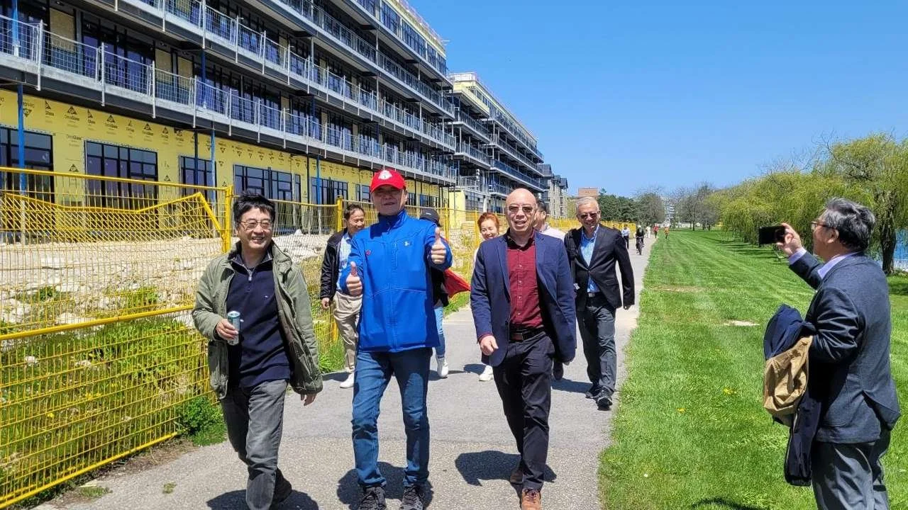周六上午11am , 春暖花开,阳光明媚,参访团一行近40人来到位于350 号Prince Charles Drive的Upper Vista Welland高级公寓项目工地 。坐落在风景绝佳的运河边的宏伟公寓映入眼帘,这一栋承载风雨蕴含故事的大楼吸引着大家的注意力和好奇的目光。