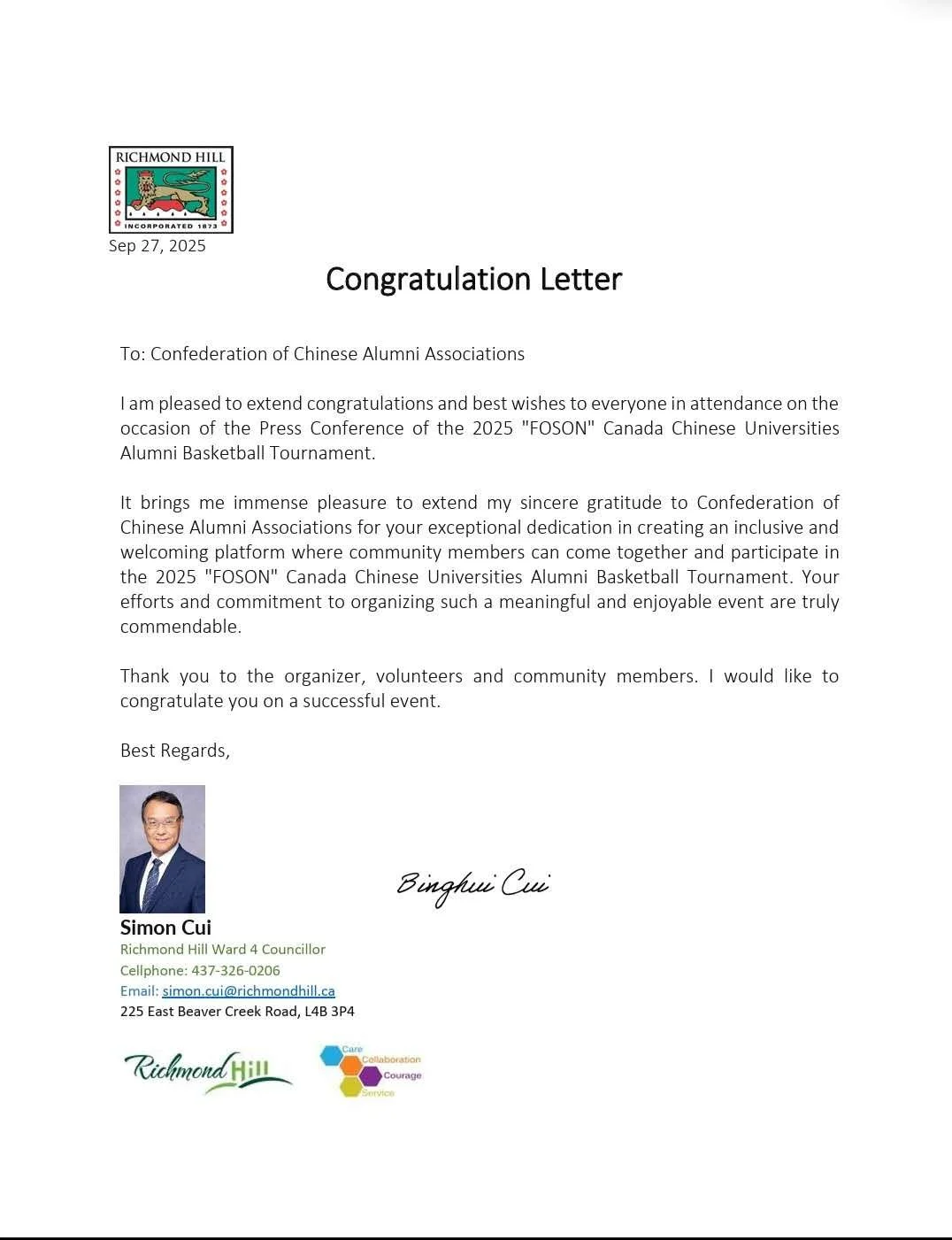 列治文山市副市长陈志辉,市议员崔冰辉,万锦市议员杨绮清发来贺信。