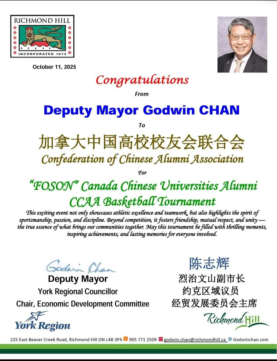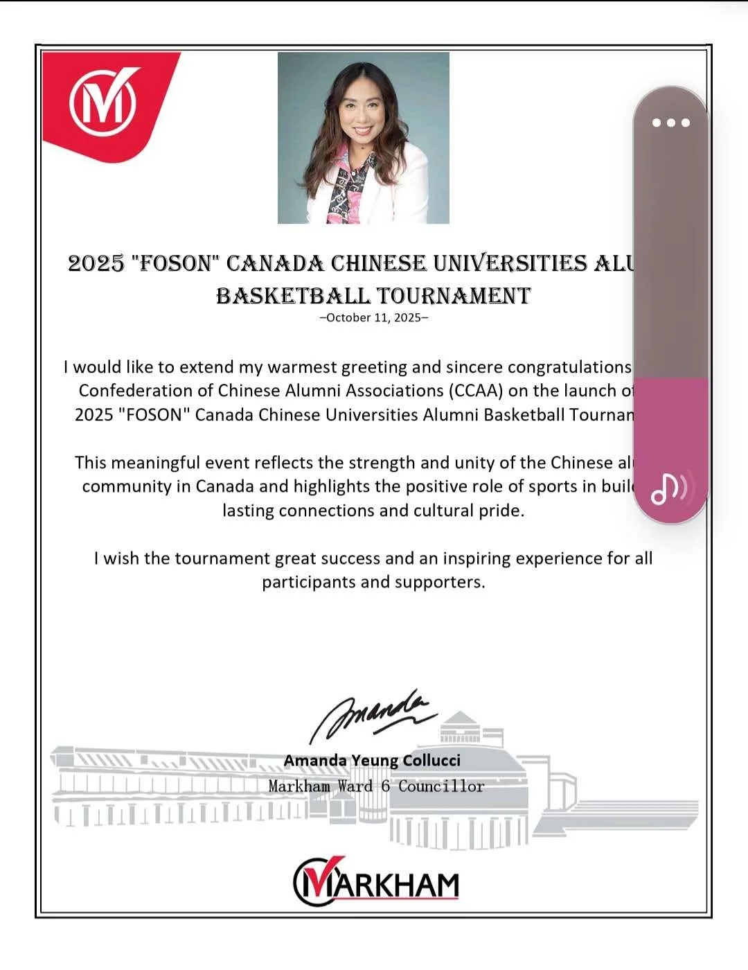 CCAA理事长贾正杰在致辞中表示:“这是我们高校社区的首场篮球大赛,必将载入高校社区体育史册。”天津大学多伦多校友会会长巨永平、冠名赞助商FOSON总裁陈亿军等嘉宾也分别致辞,表达对赛事成功举办的支持与期待。