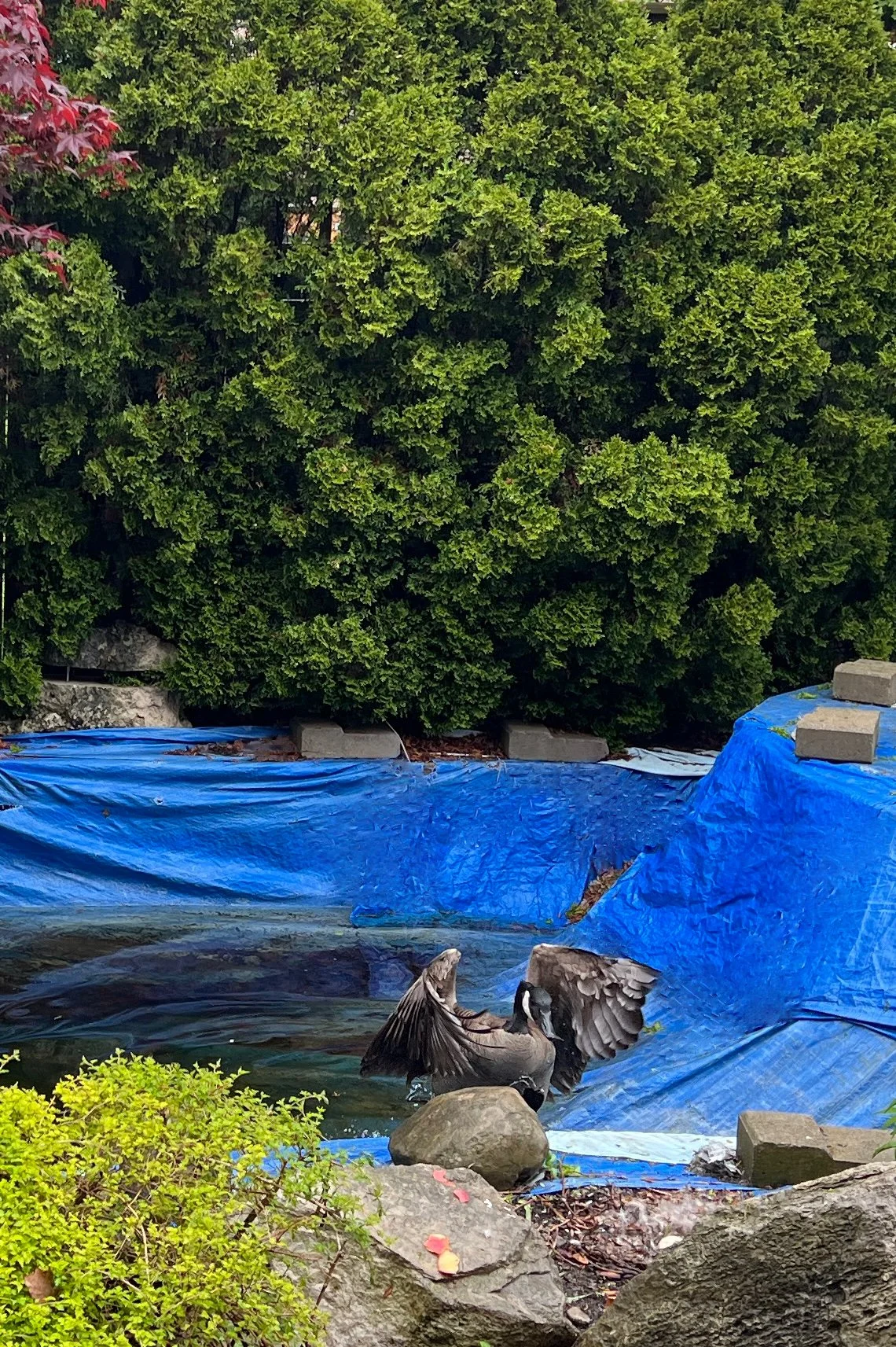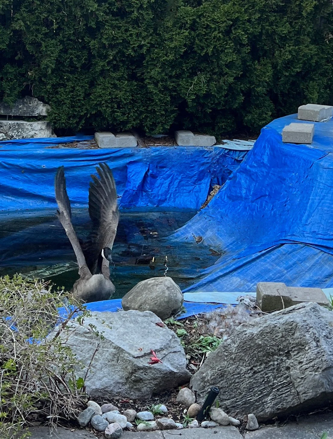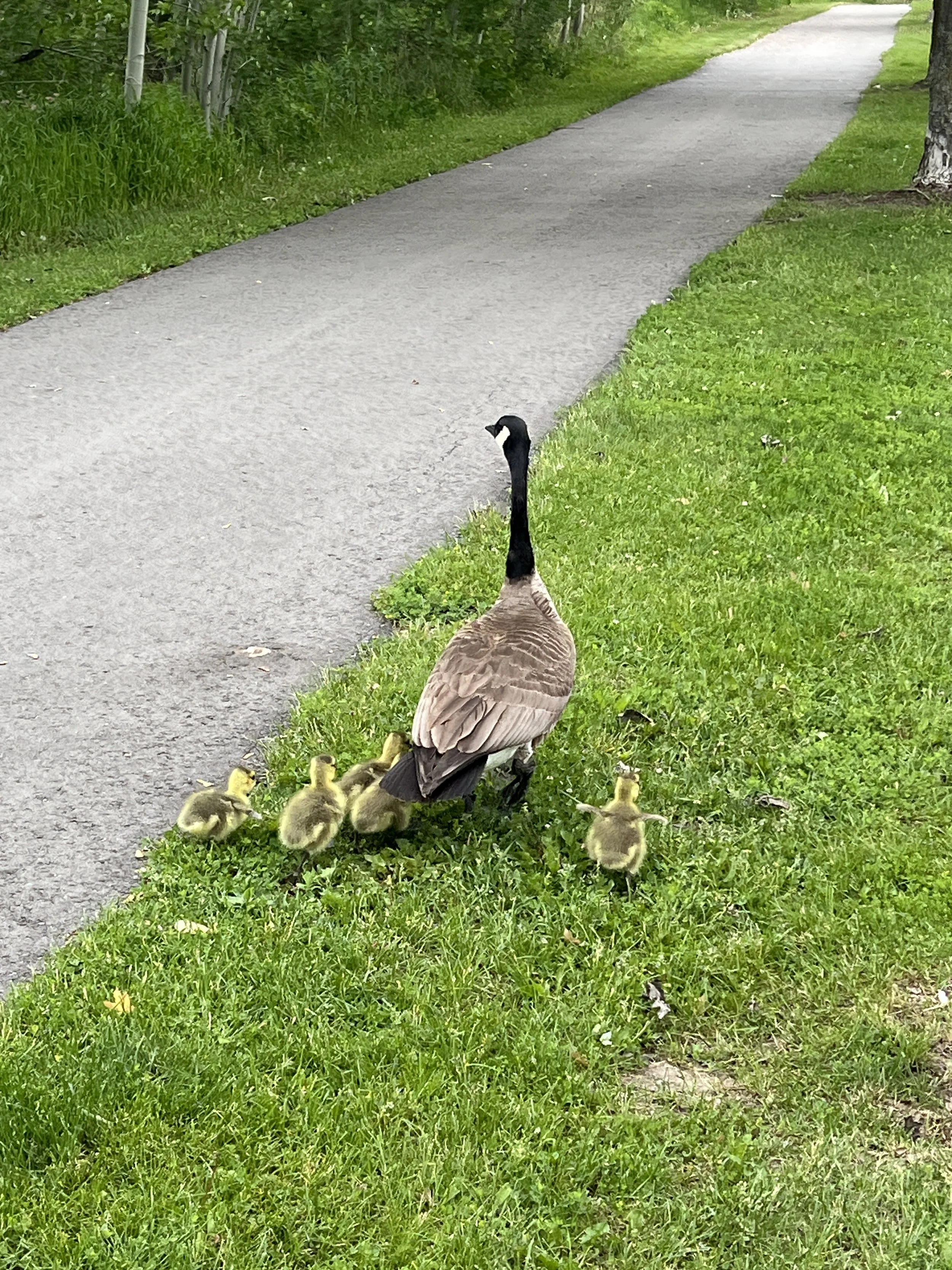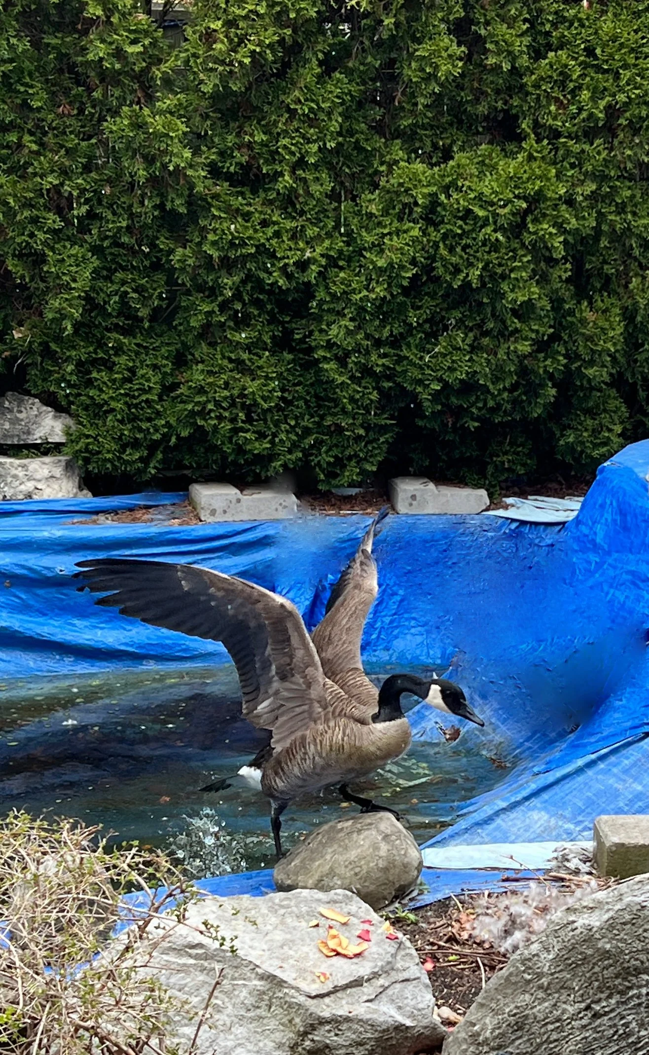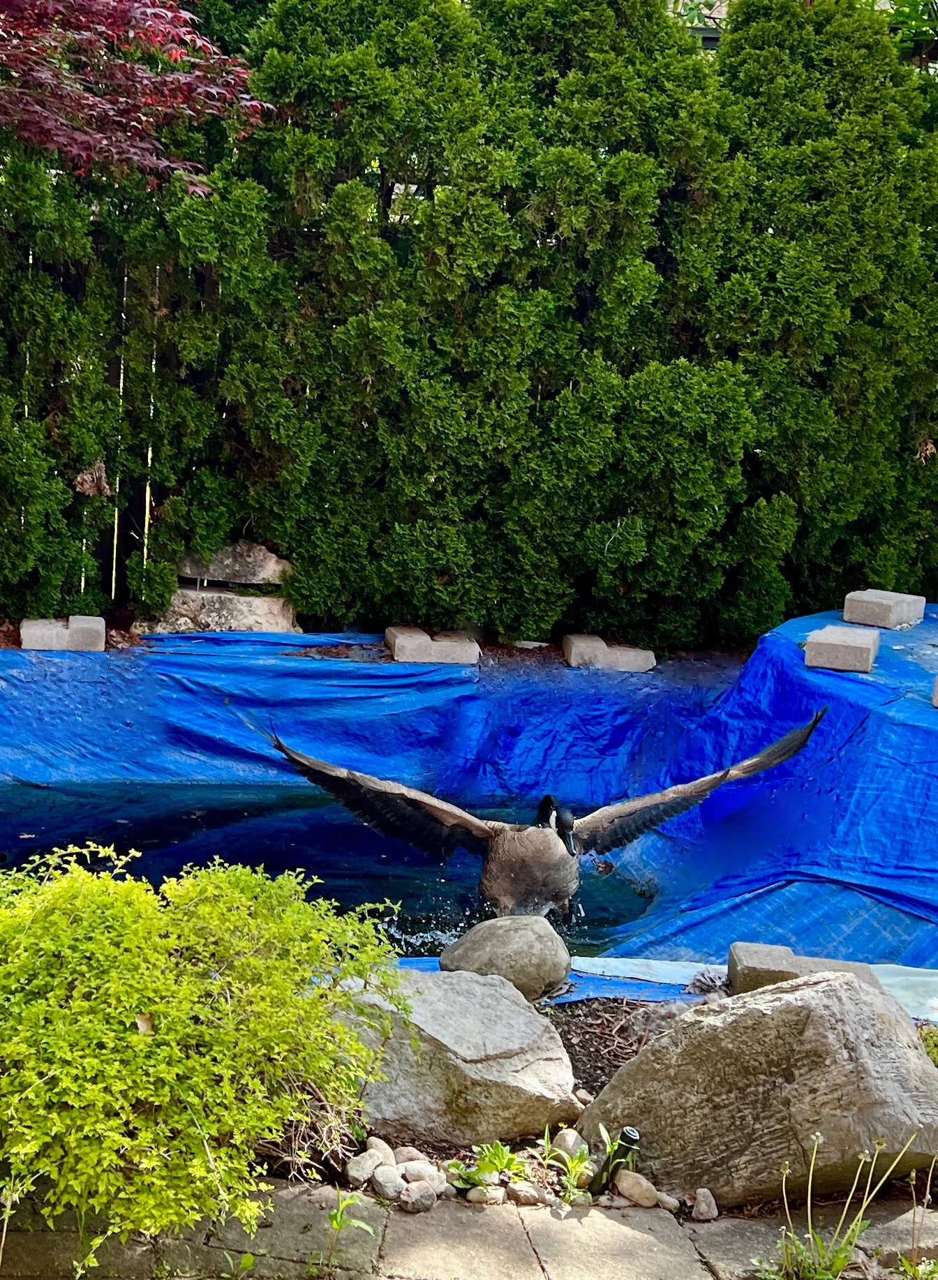 我只得退回屋中,将门关上。但鹅妈妈和小宝宝的叫声穿墙而入,声声入耳,令人揪心。多伦多的初夏仍透着几分寒意,我担心宝宝们久泡在水中会受凉生病。最终,我鼓起勇气,从花房中取来一根打捞树叶的长杆,慢慢走向泳池边,一边轻声安抚鹅妈妈,一边小心翼翼地将挣扎的小宝宝一一捞起。