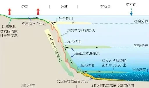 有人计算过,假设平均水深为2,000米, 盐类平均厚度为1,000米,按36‰的海水盐度计算,地中海至少需要干涸→充灌→干涸→充灌…如此像电梯一样上下循环12-14次才能满足这个条件。问题是地中海的水深真的能从0到2,000米如此反复循环12-14次或更多次数吗? 答案毫无疑问是否定的。为了解决这个问题,人们在近几十年里想起了早在上世纪20年代就已发现的冲断海底电缆的"高密度流"(实为含机械物质的浊流)。这种浊流和地中海高密度流的区别是后者为一种从高处沿大陆坡下冲的高盐高密度流体(图7)。这种流体可以在深水盆地沉淀出相当多的盐类。然而,人们后来又发现由于高密度流的海水浓度是原始体积的20%左右,其盐度充其量也只有150‰左右,所以只能形成石膏(Gypsum)和硬石膏(Anhydrite)之类盐类沉积。若要形成钠盐(Halite),海水盐度需达到350‰左右,换句话说,海水的原始体积必须从100%浓缩至10%左右才可以满足这个条件,而钾盐(Sylvite)的形成条件则更为苛克,海水体积必须浓缩至5%左右。由此可见,巨厚钠(钾)盐的形成必定还有另外的原因。然而,令人扼腕的是,这个高密度流理论支持的是深盆深水,而非深盆浅水,这和许等的干枯理论明显相悖。