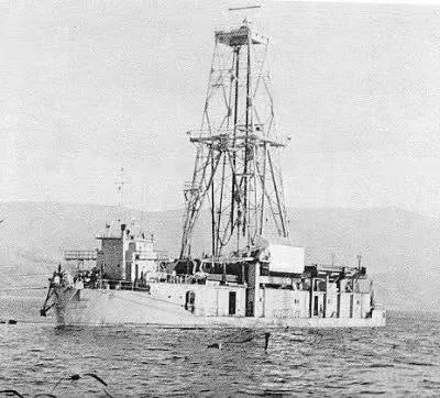 图1. “莫霍计划-Project Mohole" 钻探船 - CUSS 1号。 她是海上钻井船由大陆、联合、壳牌、苏必利尔四家公司于1956年联合建造,其前身是经过改装的二战时期驳船(图片来自网络)