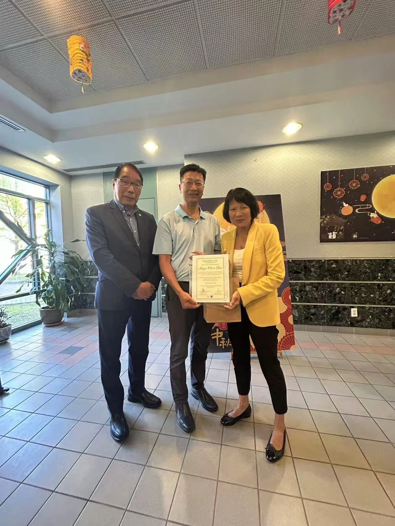 活动的亮点,无疑是特别嘉宾的莅临。联邦政府安省省议员赵成俊先生,早早抵达现场,他的出现如同一股清风,带来政界的温暖与祝福。赵议员身着简朴的正装,走上舞台,发表了热情洋溢的贺辞。他深情地说:“中秋佳节,是中华民族的传统节日,象征着团圆与和谐。在这个特殊的日子里,我代表政府向所有老人致以最诚挚的祝福。愿大家健康长寿,家庭幸福!”他的话语朴实而真挚,赢得了阵阵热烈的掌声。更令人感动的是,赵议员亲自向颐康管理层领导颁发贺信,表彰他们为社区老人所做的贡献。这不仅仅是一纸证书,更是政府对基层关爱工作的肯定。赵议员的亲民作风,体现了政界人士深入社区、贴近民众的担当。他没有停留在台上,而是走下台来,与老人们握手交谈,询问他们的生活近况。这种接地气的举动,让老人们感受到被尊重的喜悦,也凸显了加拿大多元文化社会中,对中国传统节日的尊重与包容。