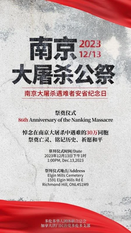 今年的12月13日是南京大屠杀惨案发生86周年,多伦多华人团体联合总会(CTCCO)联合加拿大中国洪门民治党多伦多支部共同倡议发起在南京大屠杀遇难者纪念碑前举行公祭仪式,欢迎各社团及民众个人自发参与。活动时间地点如下: