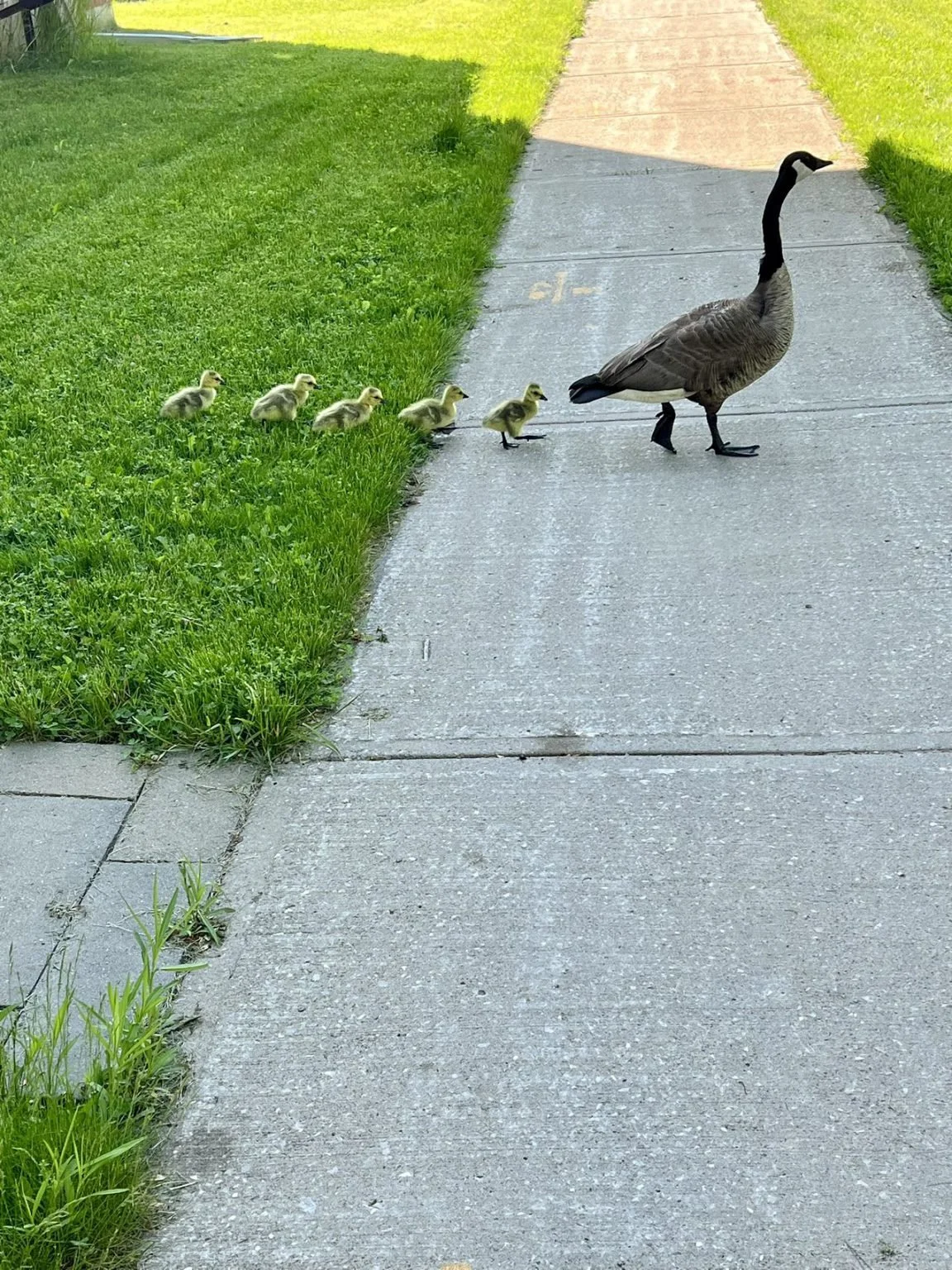 鹅妈妈毕竟属于野生动物,她仍然向往她那无拘无束的自由生活。于是在她彻底放弃孵化第6颗蛋后,也就是小宝宝出世的第三天中午,我给他们打开了后院大门,亲自送鹅妈妈和宝宝们离开。在鹅妈妈的带领下,小宝宝们排着整齐的队伍,走向大自然。