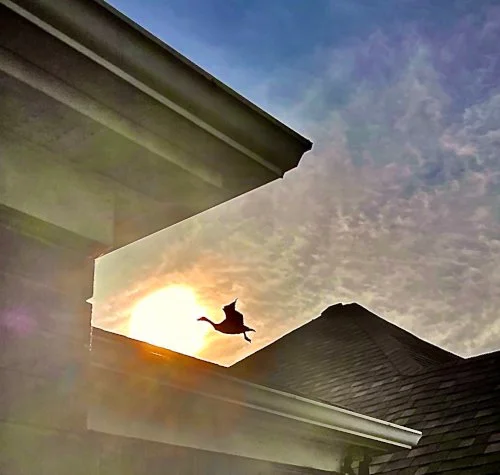 印象最深的是有一次她站在邻居家屋顶上,大声叫了好长时间,鹅爸爸都没有出现。后来见她飞走了,大约五分钟左右,我在阳台上看见他俩一前一后双双飞回,鹅妈妈终于找到她的老公了。但明显又感觉鹅妈妈很不高兴,但惦记孵化宝宝,她急匆匆地回了家。鹅爸爸追赶其后也怒气匆匆,直接冲进我家的游泳池,由于下水太急扯掉一片游泳池里的塑料布。