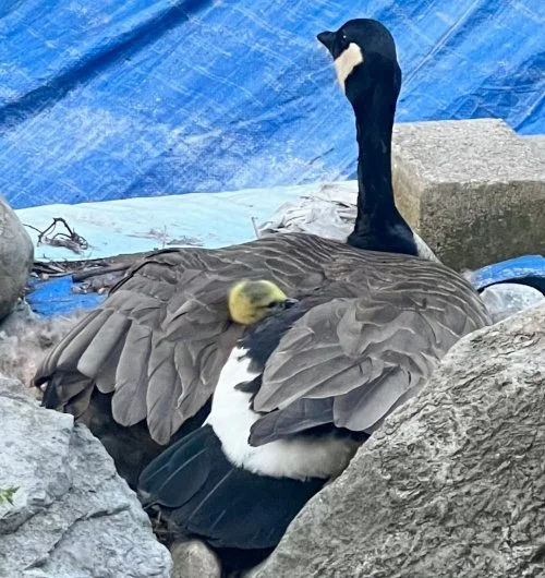 5月20号真是个好日子,也是加拿大维多利亚女王诞辰纪念日。鹅妈妈经过一个多月的辛苦努力,无论白天还是黑夜,她任由风吹雨打,太阳暴晒,鹅妈妈终于在这天孵出4个宝宝。还有两个没有孵出,鹅妈妈没有放弃,继续孵宝宝。时不时还会将已出生的小宝宝揽入怀抱之中,给宝宝爱护和温暖。